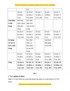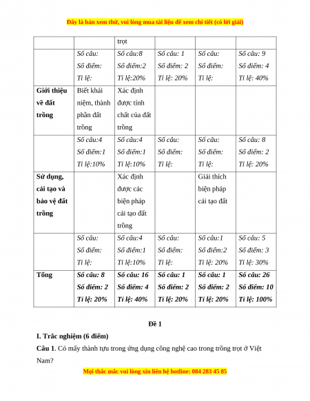 trọt Số câu: Số câu:8 Số câu: 1 Số câu: Số câu: 9 Số điểm: Số điểm:2 Số điểm: 2 Số điểm: Số điểm: 4 Tỉ lệ: Tỉ lệ:20% Tỉ lệ: 20% Tỉ lệ: Tỉ lệ: 40% Giới thiệu Biết khái Xác định về đất niệm, thành được tính trồng phần đất chất của đất trồng trồng Số câu:4 Số câu:4 Số câu: Số câu: Số câu: 8 Số điểm:1 Số điểm:1 Số điểm: Số điểm: Số điểm: 2 Tỉ lệ:10% Tỉ lệ:10% Tỉ lệ: Tỉ lệ: Tỉ lệ: 20% Sử dụng, Xác định Giải thích cải tạo và được các biện pháp bảo vệ đất biện pháp cải tạo đất trồng cải tạo đất trồng Số câu: Số câu:4 Số câu: Số câu:1 Số câu: 5 Số điểm: Số điểm:1 Số điểm: Số điểm:2 Số điểm: 3 Tỉ lệ: Tỉ lệ:10% Tỉ lệ: Tỉ lệ: 20% Tỉ lệ: 30% Tổng Số câu: 8 Số câu: 16 Số câu: 1 Số câu: 1 Số câu: 26 Số điểm: 2 Số điểm: 4 Số điểm: 2 Số điểm: 2 Số điểm: 10 Tỉ lệ: 20% Tỉ lệ: 40% Tỉ lệ: 20% Tỉ lệ: 20% Tỉ lệ: 100% Đề 1