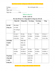 Ma trận đề học kì I, Công nghệ 10, trồng trọt, Kết nối Nhận biết Thông hiểu Vận dụng Vận dụng Tổng cao Giá thể Nêu được trồng cây các bước sản xuất giá thể Số câu:4 Số câu: Số câu: Số câu: Số câu: 4 Số điểm: 1 Số điểm: Số điểm: Số điểm: Số điểm: 1 Tỉ lệ:10% Tỉ lệ: Tỉ lệ: Tỉ lệ: Tỉ lệ: 10% Giới thiệu Phân biệt về phân được các bón loại phân bón Số câu: Số câu:8 Số câu: Số câu: Số câu: 8 Số điểm: Số điểm:2 Số điểm: Số điểm: Số điểm: 2 Tỉ lệ: Tỉ lệ:20% Tỉ lệ: Tỉ lệ: Tỉ lệ: 20% Ứng dụng Lựa chọn công nghệ phân bón vi sinh phù hợp trong sản cho cây
