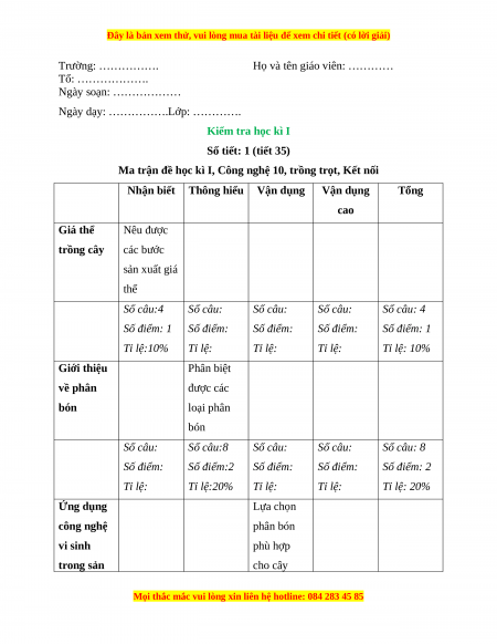 Ma trận đề học kì I, Công nghệ 10, trồng trọt, Kết nối