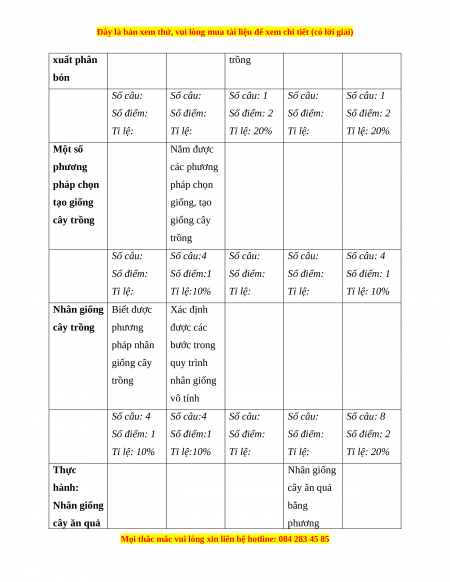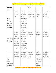 xuất phân trồng bón Số câu: Số câu: Số câu: 1 Số câu: Số câu: 1 Số điểm: Số điểm: Số điểm: 2 Số điểm: Số điểm: 2 Tỉ lệ: Tỉ lệ: Tỉ lệ: 20% Tỉ lệ: Tỉ lệ: 20% Một số Nắm được phương các phương pháp chọn pháp chọn tạo giống giống, tạo cây trồng giống cây trồng Số câu: Số câu:4 Số câu: Số câu: Số câu: 4 Số điểm: Số điểm:1 Số điểm: Số điểm: Số điểm: 1 Tỉ lệ: Tỉ lệ:10% Tỉ lệ: Tỉ lệ: Tỉ lệ: 10%