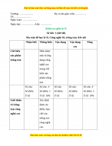Ma trận đề học kì II, Công nghệ 10, trồng trọt, Kết nối Nhận biết Thông hiểu Vận dụng Vận dụng Tổng cao Chế biến Hiểu được sản phẩm một số ứng trồng trọt dụng công nghệ cao trong chế biến sản phẩm trồng trọt Số câu: Số câu: 4 Số câu: Số câu: Số câu: 4 Số điểm: Số điểm: 1 Số điểm: Số điểm: Số điểm: 1 Tỉ lệ: Tỉ lệ: 10% Tỉ lệ: Tỉ lệ: Tỉ lệ: 10% Giới thiệu Xác định về trồng được ưu trọt công điểm, hạn nghệ cao chế của trồng trọt công nghệ cao