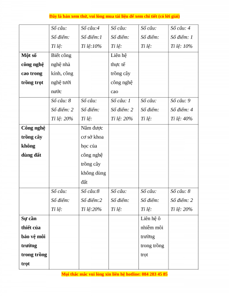 Số câu: Số câu:4 Số câu: Số câu: Số câu: 4 Số điểm: Số điểm:1 Số điểm: Số điểm: Số điểm: 1 Tỉ lệ: Tỉ lệ:10% Tỉ lệ: Tỉ lệ: Tỉ lệ: 10% Một số Biết công Liên hệ công nghệ nghệ nhà thực tế cao trong kính, công trồng cây trồng trọt nghệ tưới công nghệ nước cao Số câu: 8 Số câu: Số câu: 1 Số câu: Số câu: 9 Số điểm: 2 Số điểm: Số điểm: 2 Số điểm: Số điểm: 4 Tỉ lệ: 20% Tỉ lệ: Tỉ lệ: 20% Tỉ lệ: Tỉ lệ: 40% Công nghệ Nắm được trồng cây cơ sở khoa không học của dùng đất công nghệ trồng cây không dùng đất Số câu: Số câu:8 Số câu: Số câu: Số câu: 8 Số điểm: Số điểm:2 Số điểm: Số điểm: Số điểm: 2 Tỉ lệ: Tỉ lệ:20% Tỉ lệ: Tỉ lệ: Tỉ lệ: 20% Sự cần Liên hệ ô thiết của nhiễm môi bảo vệ môi trường trường trong trồng trong trồng trọt trọt
