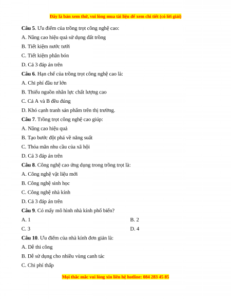 Câu 7. Trồng trọt công nghệ cao giúp: A. Nâng cao hiệu quả