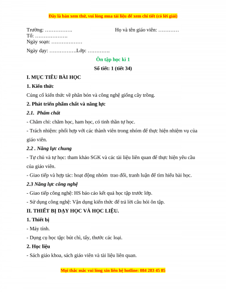 Giáo án Công nghệ 10 (Kết nối tri thức) Bài Ôn tập học kì 1