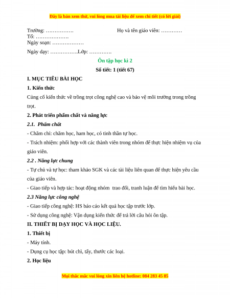 Giáo án Công nghệ 10 (Kết nối tri thức) Bài Ôn tập học kì 2