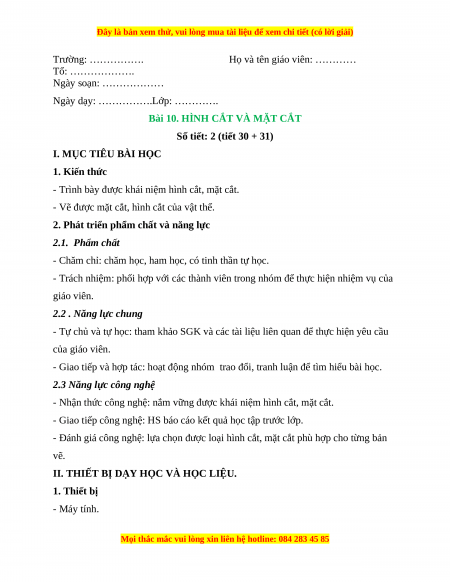 Bài 10. HÌNH CẮT VÀ MẶT CẮT