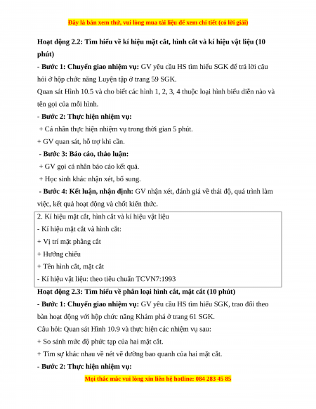 Hoạt động 2.2: Tìm hiểu về kí hiệu mặt cắt, hình cắt và kí hiệu vật liệu (10