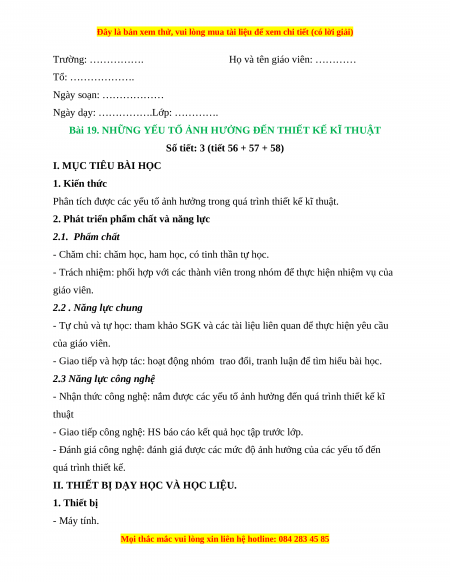 Giáo án Công nghệ 10 Thiết kế Bài 19 (Kết nối tri thức): Những yếu tố ảnh hưởng đến thiết kế kĩ thuật