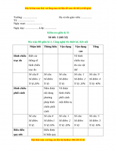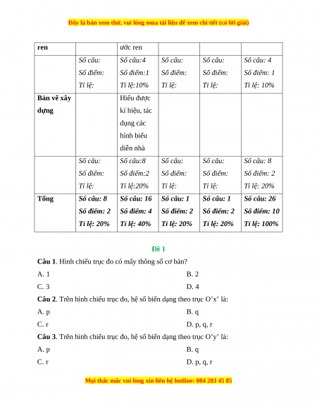 ren ước ren Số câu: Số câu:4 Số câu: Số câu: Số câu: 4 Số điểm: Số điểm:1 Số điểm: Số điểm: Số điểm: 1 Tỉ lệ: Tỉ lệ:10% Tỉ lệ: Tỉ lệ: Tỉ lệ: 10% Bản vẽ xây Hiểu được dựng kí hiệu, tác dụng các hình biểu diễn nhà Số câu: Số câu:8 Số câu: Số câu: Số câu: 8 Số điểm: Số điểm:2 Số điểm: Số điểm: Số điểm: 2 Tỉ lệ: Tỉ lệ:20% Tỉ lệ: Tỉ lệ: Tỉ lệ: 20% Tổng Số câu: 8 Số câu: 16 Số câu: 1 Số câu: 1 Số câu: 26 Số điểm: 2 Số điểm: 4 Số điểm: 2 Số điểm: 2 Số điểm: 10 Tỉ lệ: 20% Tỉ lệ: 40% Tỉ lệ: 20% Tỉ lệ: 20% Tỉ lệ: 100% Đề 1
