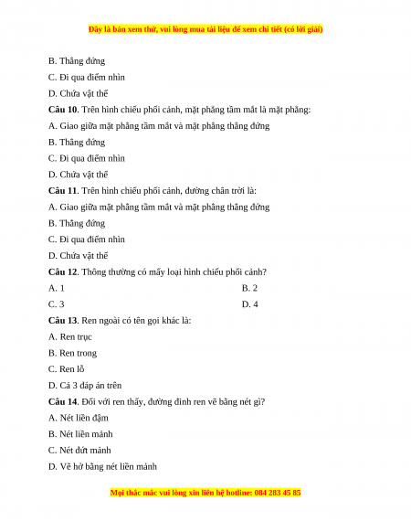 Câu 10. Trên hình chiếu phối cảnh, mặt phẳng tầm mắt là mặt phẳng: