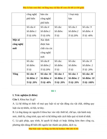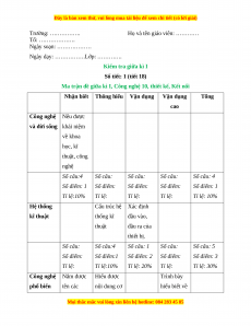 công nghệ bản của 1 loại máy phổ biến công nghệ hàn phổ biến Số câu:4 Số câu:4 Số câu: Số câu:1 Số câu: 9 Số điểm:1 Số điểm:1 Số điểm: Số điểm:2 Số điểm: 4 Tỉ lệ:10% Tỉ lệ:10% Tỉ lệ: Tỉ lệ:20% Tỉ lệ: 40% Một số Xác định công nghệ được bản mới chất của các công nghệ mới Số câu: Số câu:8 Số câu: Số câu: Số câu: 8 Số điểm: Số điểm:2 Số điểm: Số điểm: Số điểm: 2 Tỉ lệ: Tỉ lệ:20% Tỉ lệ: Tỉ lệ: Tỉ lệ: 20% Tổng Số câu: 8 Số câu: 16 Số câu: 1 Số câu: 1 Số câu: 26 Số điểm: 2 Số điểm: 4 Số điểm: 2 Số điểm: 2 Số điểm: 10 Tỉ lệ: 20% Tỉ lệ: 40% Tỉ lệ: 20% Tỉ lệ: 20% Tỉ lệ: 100% Đề 1