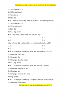 Câu 7. Phần tử nào sau đây thuộc bộ phận xử lí của hệ thống kĩ thuật? A. Thông tin cần xử lí B. Thông tin đã xử lí C. Biến đổi D. Cả 3 đáp án trên