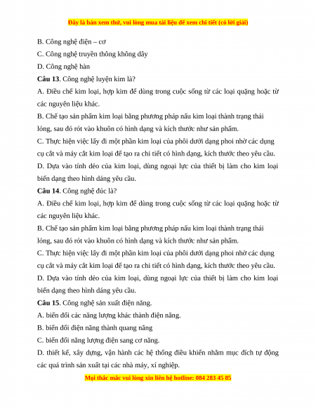 Câu 10. Công nghệ nào sau đây thuộc lĩnh vực luyện kim, cơ khí? A. Công nghệ luyện kim B. Công nghệ đúc