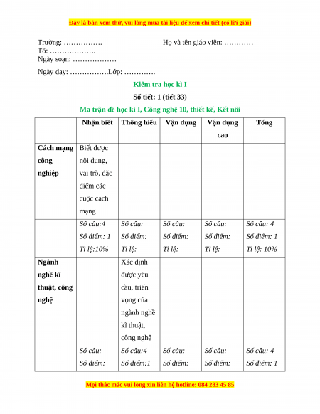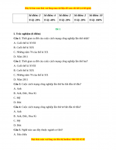 Cách mạng Biết được công nội dung, nghiệp vai trò, đặc điểm các cuộc cách mạng Số câu:4 Số câu: Số câu: Số câu: Số câu: 4 Số điểm: 1 Số điểm: Số điểm: Số điểm: Số điểm: 1 Tỉ lệ:10% Tỉ lệ: Tỉ lệ: Tỉ lệ: Tỉ lệ: 10% Ngành Xác định nghề kĩ được yêu thuật, công cầu, triển nghệ vọng của ngành nghề kĩ thuật, công nghệ Số câu: Số câu:4 Số câu: Số câu: Số câu: 4 Số điểm: Số điểm:1 Số điểm: Số điểm: Số điểm: 1