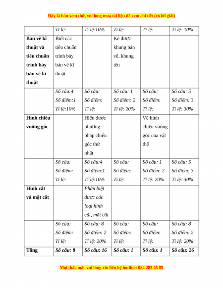 tiêu chuẩn trình bày vẽ, khung trình bày bản vẽ kĩ tên bản vẽ kĩ thuật thuật Số câu:4 Số câu: Số câu: 1 Số câu: Số câu: 5 Số điểm:1 Số điểm: Số điểm: 2 Số điểm: Số điểm: 3 Tỉ lệ:10% Tỉ lệ: Tỉ lệ: 20% Tỉ lệ: Tỉ lệ: 30% Hình chiếu Hiểu được Vẽ hình vuông góc phương chiếu vuông pháp chiếu góc của vật góc thứ thể nhất Số câu: Số câu:4 Số câu: Số câu: 1 Số câu: 5 Số điểm: Số điểm:1 Số điểm: Số điểm: 2 Số điểm: 3 Tỉ lệ: Tỉ lệ:10% Tỉ lệ: Tỉ lệ: 20% Tỉ lệ: 30% Hình cắt Phân biệt và mặt cắt được các loại hình cắt, mặt cắt Số câu: Số câu: 8 Số câu: Số câu: Số câu: 8 Số điểm: Số điểm: 2 Số điểm: Số điểm: Số điểm: 2 Tỉ lệ: Tỉ lệ: 20% Tỉ lệ: Tỉ lệ: Tỉ lệ: 20% Tổng Số câu: 8 Số câu: 16 Số câu: 1 Số câu: 1 Số câu: 26