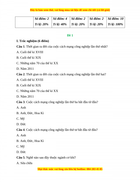 Câu 1. Thời gian ra đời của cuộc cách mạng công nghiệp lần thứ nhất? A. Cuối thế kỉ XVIII B. Cuối thế kỉ XIX