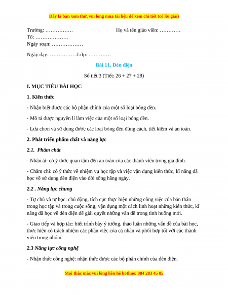 - Nhận thức công nghệ: nhận thức được các bộ phận chính của đèn điện.