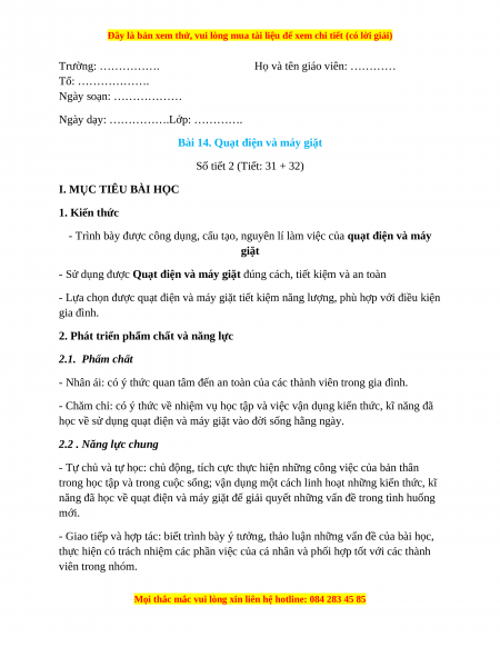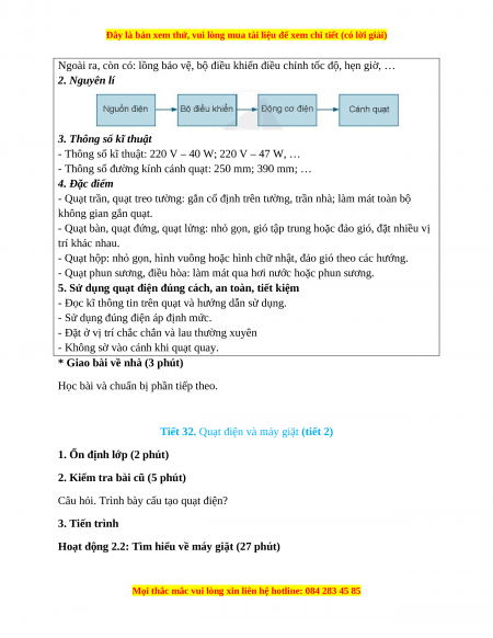 Giáo án Công nghệ 6 Bài 14 (Cánh diều): Quạt điện và máy giặt