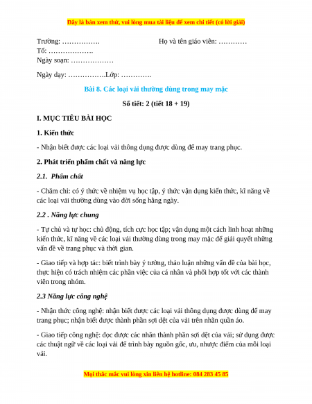 Giáo án Công nghệ 6 Bài 8 (Cánh diều): Các loại vải thường dùng trong may mặc