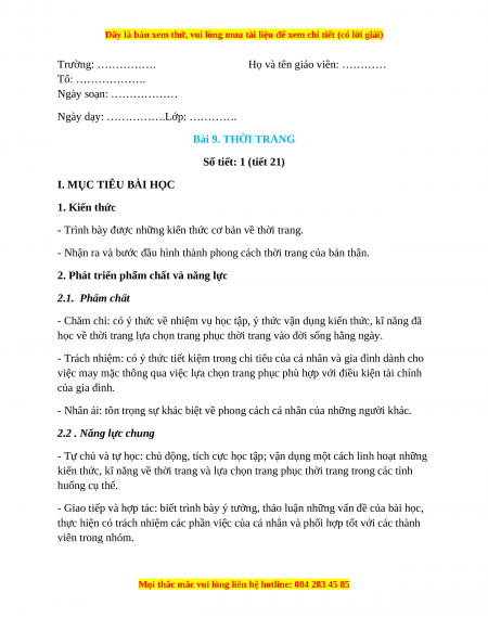 Ngày dạy: …………….Lớp: …………. Bài 9. THỜI TRANG