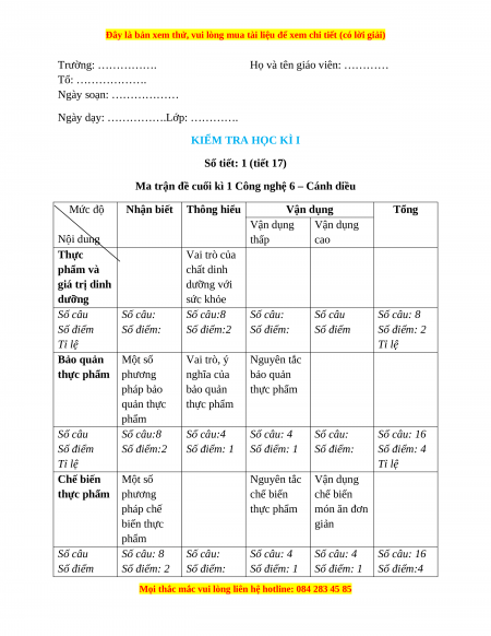 Ma trận đề cuối kì 1 Công nghệ 6 – Cánh diều Mức độ Nhận biết Thông hiểu Vận dụng Tổng Vận dụng Vận dụng Nội dung thấp cao Thực Vai trò của phẩm và chất dinh giá trị dinh dưỡng với dưỡng sức khỏe Số câu Số câu: Số câu:8 Số câu: Số câu Số câu: 8 Số điểm Số điểm: Số điểm:2 Số điểm: Số điểm Số điểm: 2 Tỉ lệ Tỉ lệ Bảo quản Một số Vai trò, ý Nguyên tắc thực phẩm phương nghĩa của bảo quản pháp bảo bảo quản thực phẩm quản thực thực phẩm phẩm Số câu Số câu:8 Số câu:4 Số câu: 4 Số câu: Số câu: 16 Số điểm Số điểm:2 Số điểm: 1 Số điểm: 1 Số điểm: Số điểm: 4 Tỉ lệ Tỉ lệ Chế biến Một số Nguyên tắc Vận dụng thực phẩm phương chế biến chế biến pháp chế thực phẩm món ăn đơn biến thực giản phẩm Số câu Số câu: 8 Số câu: Số câu: 4 Số câu: 4 Số câu: 16 Số điểm Số điểm: 2 Số điểm: Số điểm: 1 Số điểm: 1 Số điểm:4