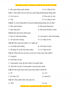 Câu 12. Bảo quản lạnh là bảo quản thực phẩm ở nhiệt độ: A. 00C B. 150C C. 00C đến 150C D. Dưới 00C