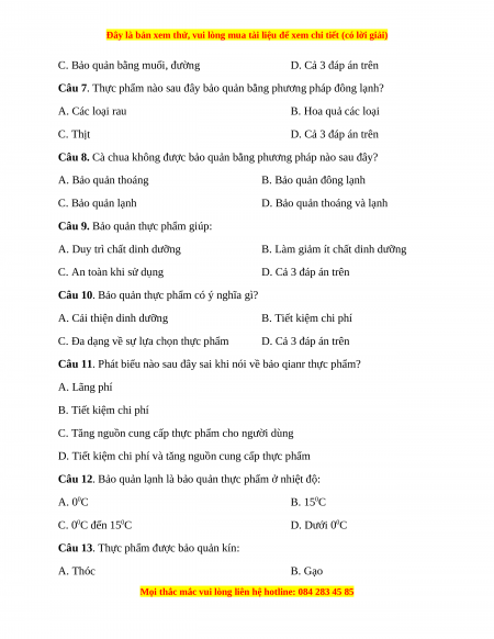 Câu 6. Đâu không phải phương pháp bảo quản ở nhiệt độ thấp? A. Bảo quản lạnh B. Bảo quản đông lạnh