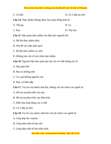 Câu 14. Thực phẩm không được bảo quản đông lạnh là: A. Thịt gà B. Cá C. Rau D. Thịt lợn
