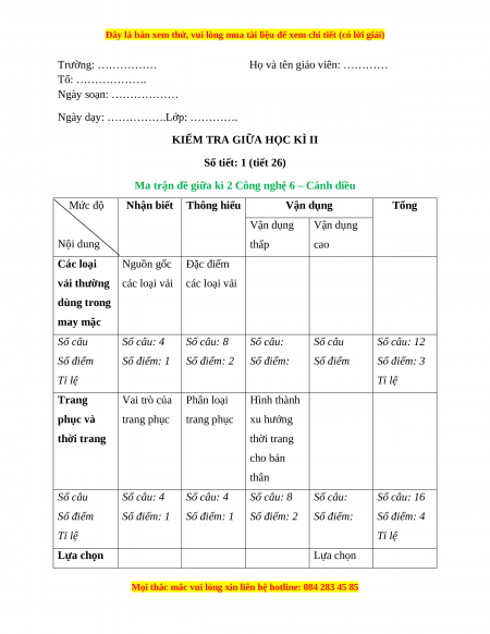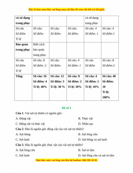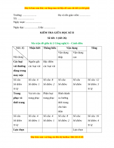 vải thường các loại vải các loại vải dùng trong may mặc Số câu Số câu: 4 Số câu: 8 Số câu: Số câu Số câu: 12 Số điểm Số điểm: 1 Số điểm: 2 Số điểm: Số điểm Số điểm: 3 Tỉ lệ Tỉ lệ Trang Vai trò của Phân loại Hình thành phục và trang phục trang phục xu hướng thời trang thời trang cho bản thân Số câu Số câu: 4 Số câu: 4 Số câu: 8 Số câu: Số câu: 16 Số điểm Số điểm: 1 Số điểm: 1 Số điểm: 2 Số điểm: Số điểm: 4 Tỉ lệ Tỉ lệ Lựa chọn Lựa chọn
