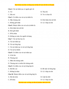 Câu 8. Ưu điểm của vải sợi nhân tạo: A. ít hút ẩm B. Thoáng mát C. Mềm khi nhúng nước