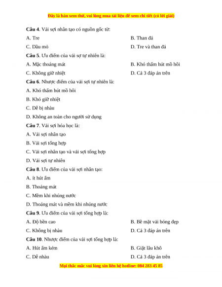 Câu 10. Nhược điểm của vải sợi tổng hợp là: A. Hút ẩm kém B. Giặt lâu khô C. Dễ nhàu D. Cả 3 đáp án trên