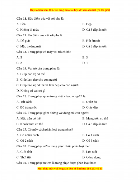 Câu 11. Đặc điểm của vải sợi pha là: A. Bền B. Đẹp C. Không bị nhàu D. Cả 3 đáp án trên