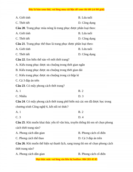 Câu 17. Có mấy cách phân loại trang phục? A. Có nhiều cách B. Có 1 cách C. Có 2 cách D. Có 3 cách