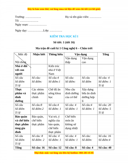 Ma trận đề cuối kì 1 Công nghệ 6 – Chân trời Mức độ Nhận biết Thông hiểu Vận dụng Tổng Vận dụng Vận dụng Nội dung thấp cao Nhà ở đối Kiến trúc với con nhà ở Việt người Nam Số câu Số câu: Số câu:4 Số câu: Số câu Số câu: 4 Số điểm Số điểm: Số điểm:1 Số điểm: Số điểm Số điểm: 1 Tỉ lệ Tỉ lệ Thực Các nhóm Chế độ ăn Nhu cầu Xây dựng phẩm và thực phẩm uống khoa dinh dưỡng bữa ăn dinh dinh chính học của cơ thể dưỡng hợp dưỡng lí Số câu Số câu:8 Số câu:4 Số câu: 4 Số câu:4 Số câu: 20 Số điểm Số điểm:2 Số điểm: 1 Số điểm: 1 Số điểm: 1 Số điểm: 5 Tỉ lệ Tỉ lệ Bảo quản Bảo quản, Vai trò, ý Chế biến