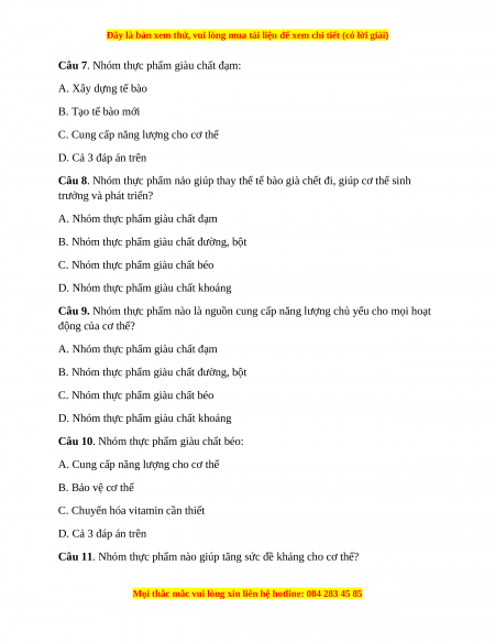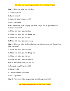Câu 7. Nhóm thực phẩm giàu chất đạm: A. Xây dựng tế bào B. Tạo tế bào mới