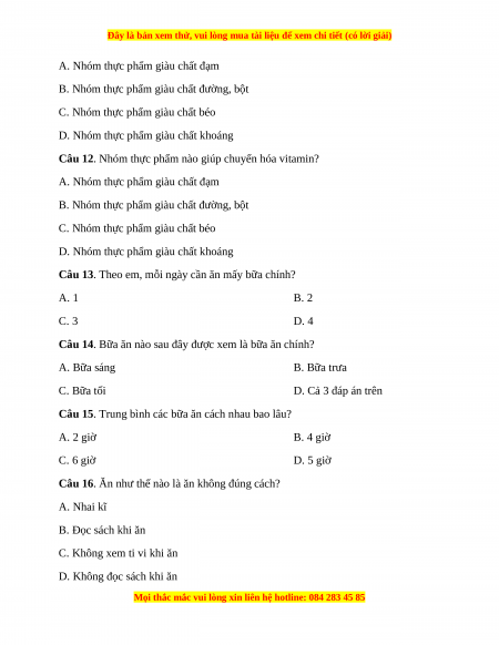 Câu 13. Theo em, mỗi ngày cần ăn mấy bữa chính? A. 1 B. 2 C. 3 D. 4