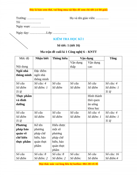 Ma trận đề cuối kì 1 Công nghệ 6 – KNTT Mức độ Nhận biết Thông hiểu Vận dụng Tổng Vận dụng Vận dụng Nội dung thấp cao Ngôi nhà Đặc điểm thông minh ngôi nhà thông minh Số câu Số câu: 4 Số câu Số câu Số câu Số câu: 4 Số điểm Số điểm: 1 Số điểm Số điểm Số điểm Số điểm: 1 Tỉ lệ Tỉ lệ Thực phẩm Hình thành và dinh thói quen dưỡng ăn uống khoa học Số câu Số câu Số câu Số câu Số câu: 4 Số câu: 4 Số điểm Số điểm Số điểm Số điểm Số điểm: 1 Số điểm: 1 Tỉ lệ Tỉ lệ Phương Kể tên Hiểu được pháp bảo phương một số quản về pháp chế phương chế biến biến, bảo pháp chế thực phẩm quản thực biến, bảo phẩm quản thực phẩm Số câu Số câu: 8 Số câu: 8 Số câu: Số câu Số câu: 16 Số điểm Số điểm: 2 Số điểm: 2 Số điểm: Số điểm Số điểm:4