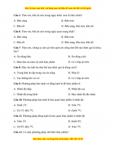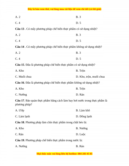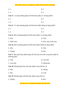 Câu 13 . Có mấy phương pháp chế biến thực phẩm có sử dụng nhiệt? A. 2 B. 3 C. 4 D. 5
