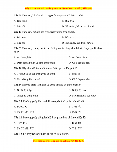 Câu 11. Phương pháp đông lạnh là bảo quản thực phẩm ở nhiệt độ: A. Trên 10C B. Dưới 00C C. Từ 00C đến 70C D. Trên 70C