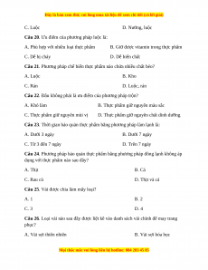 Câu 17. Bảo quản thực phẩm bằng cách làm bay hơi nước trong thực phẩm là phương pháp? A. Ướp B. Làm khô C. Làm lạnh D. Đông lạnh