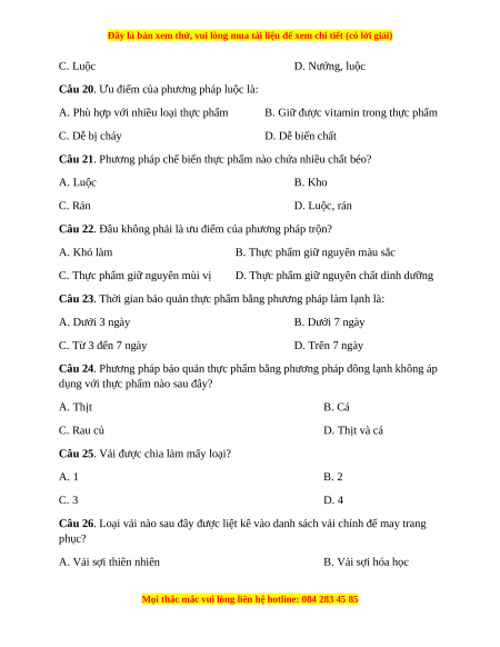 Câu 19. Phương pháp chế biến thực phẩm trong nước là: A. Nướng B. Rán