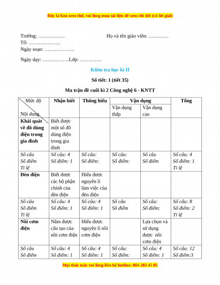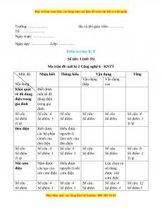 Ma trận đề cuối kì 2 Công nghệ 6 - KNTT Mức độ Nhận biết Thông hiểu Vận dụng Tổng Vận dụng Vận dụng Nội dung thấp cao Khái quát Biết được về đồ dùng một số đồ điện trong dùng điện gia đình trong gia đình Số câu Số câu: 4 Số câu: Số câu: Số câu Số câu: 4 Số điểm Số điểm: 1 Số điểm: Số điểm: Số điểm Số điểm: 1 Tỉ lệ Tỉ lệ Đèn điện Biết được Hiểu được các bộ phận nguyên lí chính của làm việc của đèn điện đèn điện Số câu Số câu: 4 Số câu: 4 Số câu Số câu: Số câu: 8 Số điểm Số điểm: 1 Số điểm: 1 Số điểm Số điểm: Số điểm: 2 Tỉ lệ Tỉ lệ Nồi cơm Nắm được Hiểu được Lựa chọn và điện cấu tạo của nguyên lí nồi sử dụng