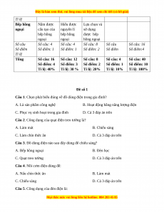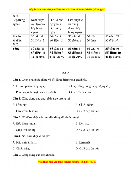 Tỉ lệ Bếp hồng Nắm được Hiểu được Lựa chọn và ngoại cấu tạo của nguyên lí sử dụng bếp hồng bếp hồng được bếp ngoại ngoại hồng ngoại Số câu Số câu: 4 Số câu: 4 Số câu: 8 Số câu Số câu: 16 Số điểm Số điểm: 1 Số điểm: 1 Số điểm: 2 Số điểm Số điểm:4 Tỉ lệ Tổng Số câu: 16 Số câu: 12 Số câu: 8 Số câu: 4 Số câu: 40 Số điểm: 4 Số điểm: 3 Số điểm: 2 Số điểm: 1 Số điểm: 10 Tỉ lệ: 40% Tỉ lệ: 30 % Tỉ lệ: 20% Tỉ lệ: 10% Tỉ lệ: 100% Đề số 1