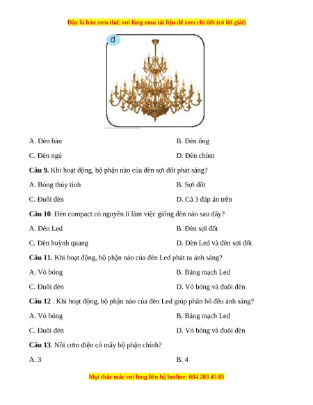 Câu 9. Khi hoạt động, bộ phận nào của đèn sợi đốt phát sáng? A. Bóng thủy tinh B. Sợi đốt C. Đuôi đèn D. Cả 3 đáp án trên