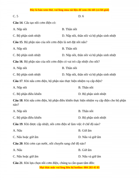 Câu 13. Nồi cơm điện có mấy bộ phận chính? A. 3 B. 4