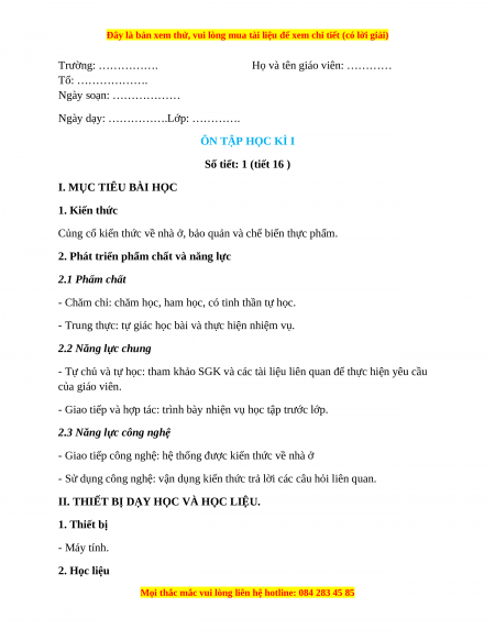 Giáo án Công nghệ 6 Ôn tập học kì 1 (Cánh diều)