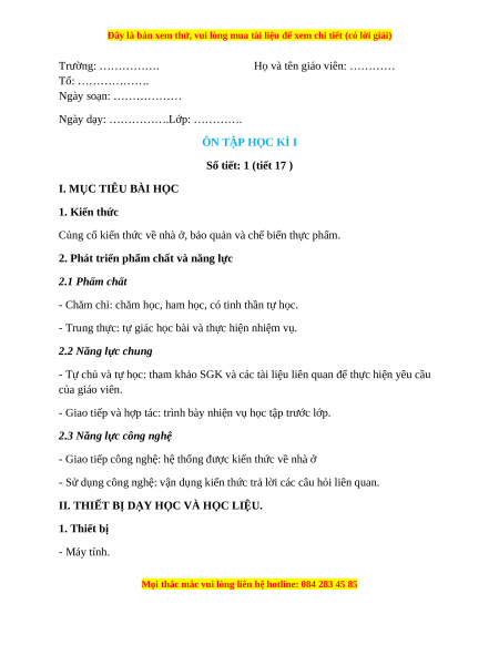 Giáo án Công nghệ 6 Ôn tập học kì 1 (Kết nối tri thức)