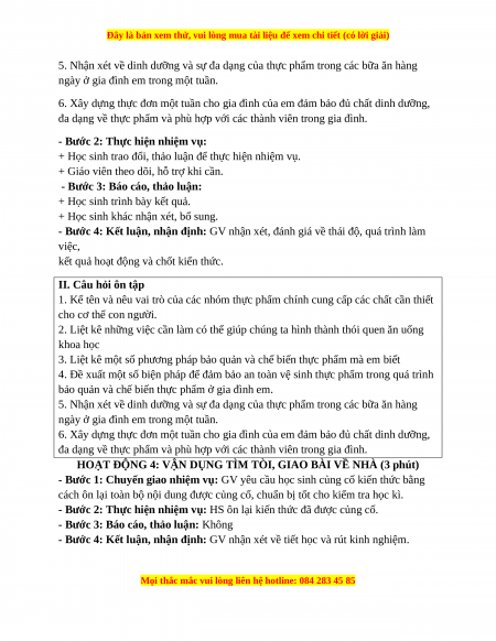 và chế biến thực phẩm và yêu cầu học sinh trả lời một số câu hỏi liên quan.