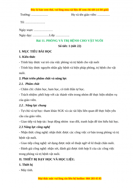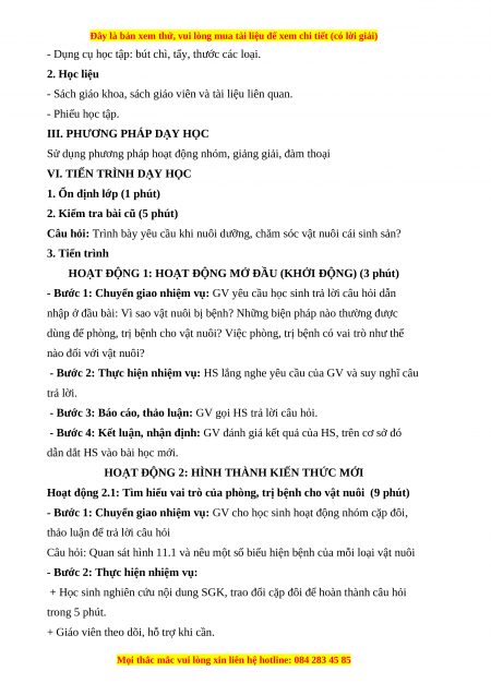 Giáo án Công nghệ 7 Bài 11 (Kết nối tri thức): Phòng và trị bệnh cho vật nuôi