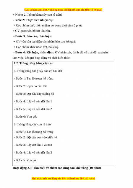 kết quả hoạt động và chốt kiến thức. 1. Trồng rừng 1.1. Chuẩn bị a. Chuẩn bị cây con